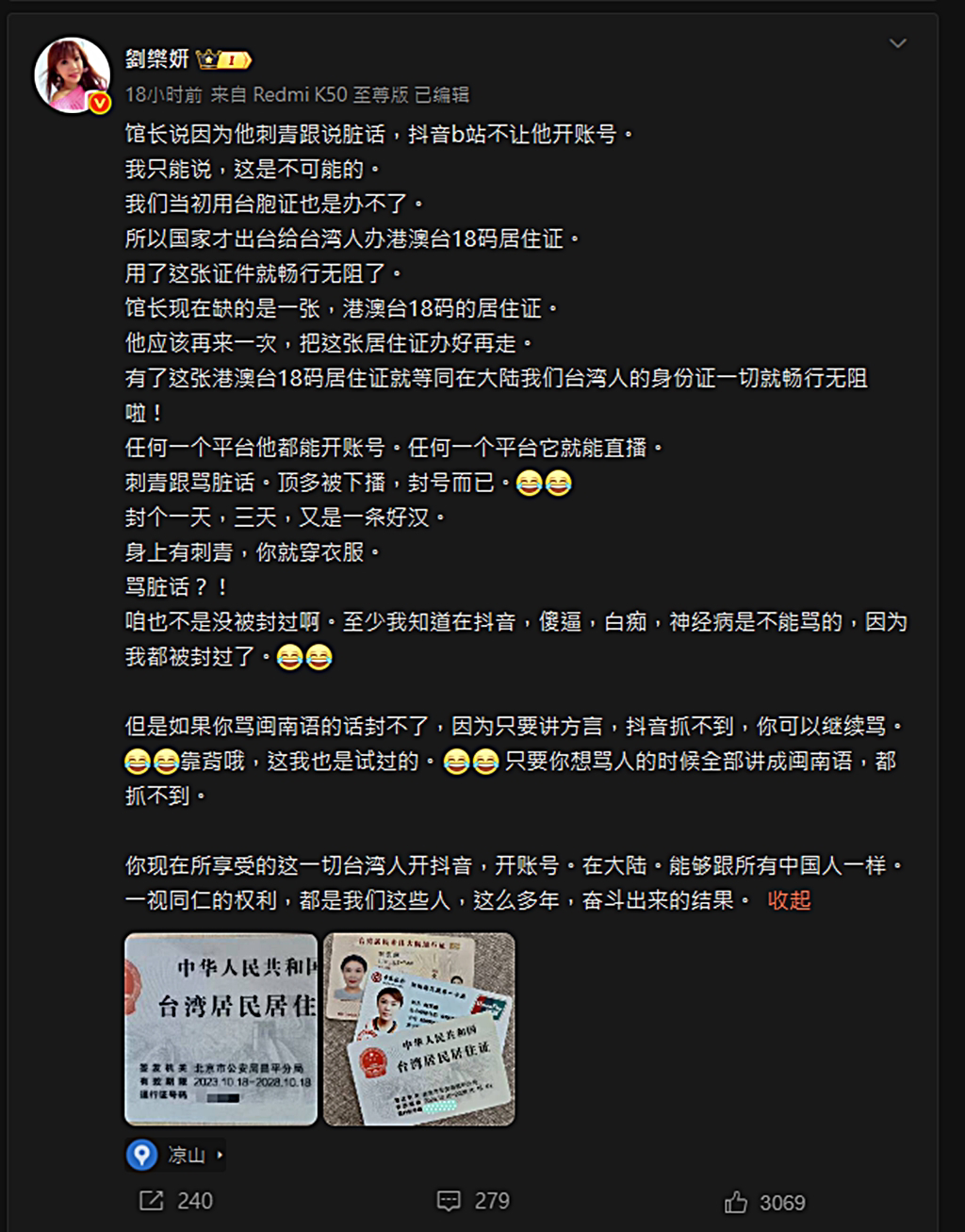 劉樂妍昨發(fā)文說,館長抱怨自己說臟話、刺青,無法在抖音跟bilibili開帳號,劉樂妍直言不可能,解釋:“我們當初用臺胞證也是辦不了。 所以國家才推出給臺灣人辦港澳臺18碼居住證。 用了這張證件就暢行無阻了”,并提醒他下次來要辦好這一張,之后就可以暢行無阻。