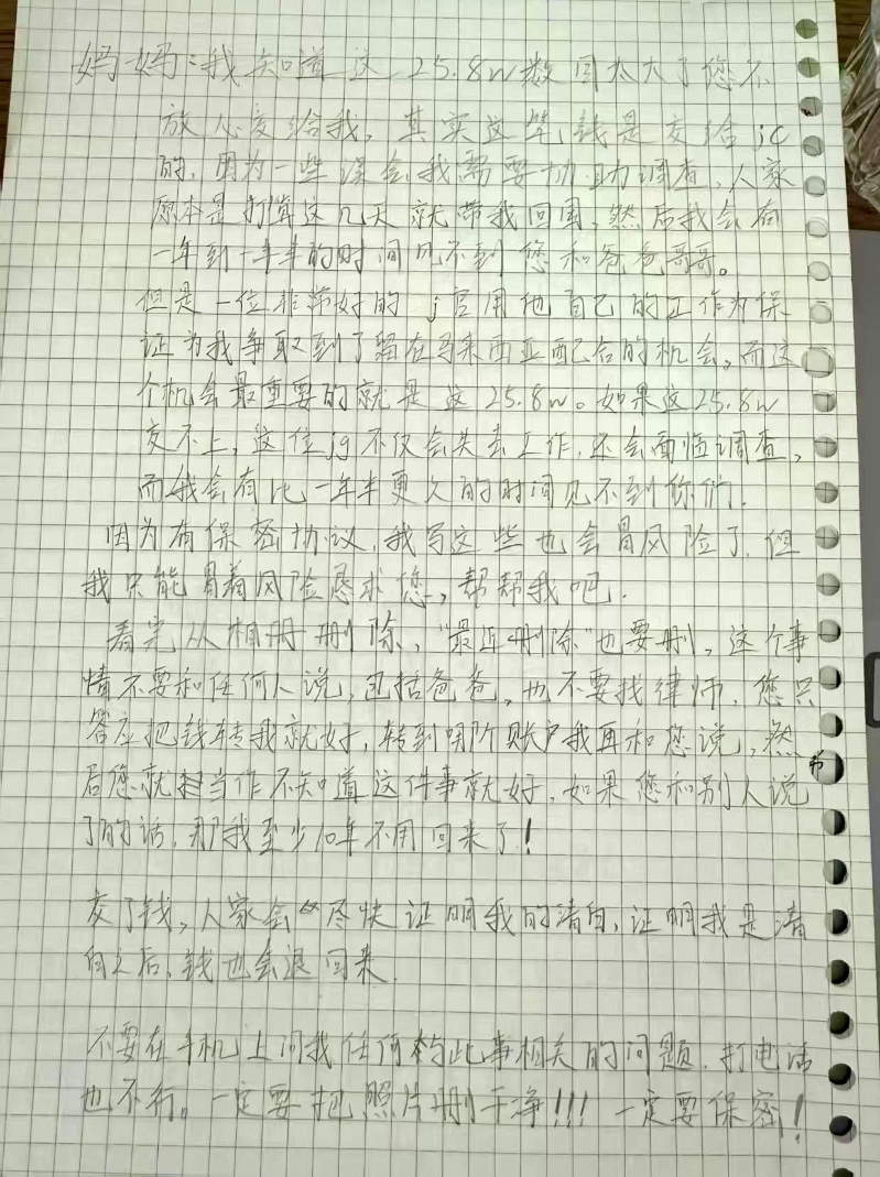 發(fā)給母親隨即撤回的“手寫文字”中,小文表示,“如果這25.8萬交不上,這位警官不僅會失去工作,還會面臨調查,而我會有比一年半更久的時間見不到你們......交了錢,人家會盡快證明我的清白,證明我是清白之后,我也會(把錢)退回來......”