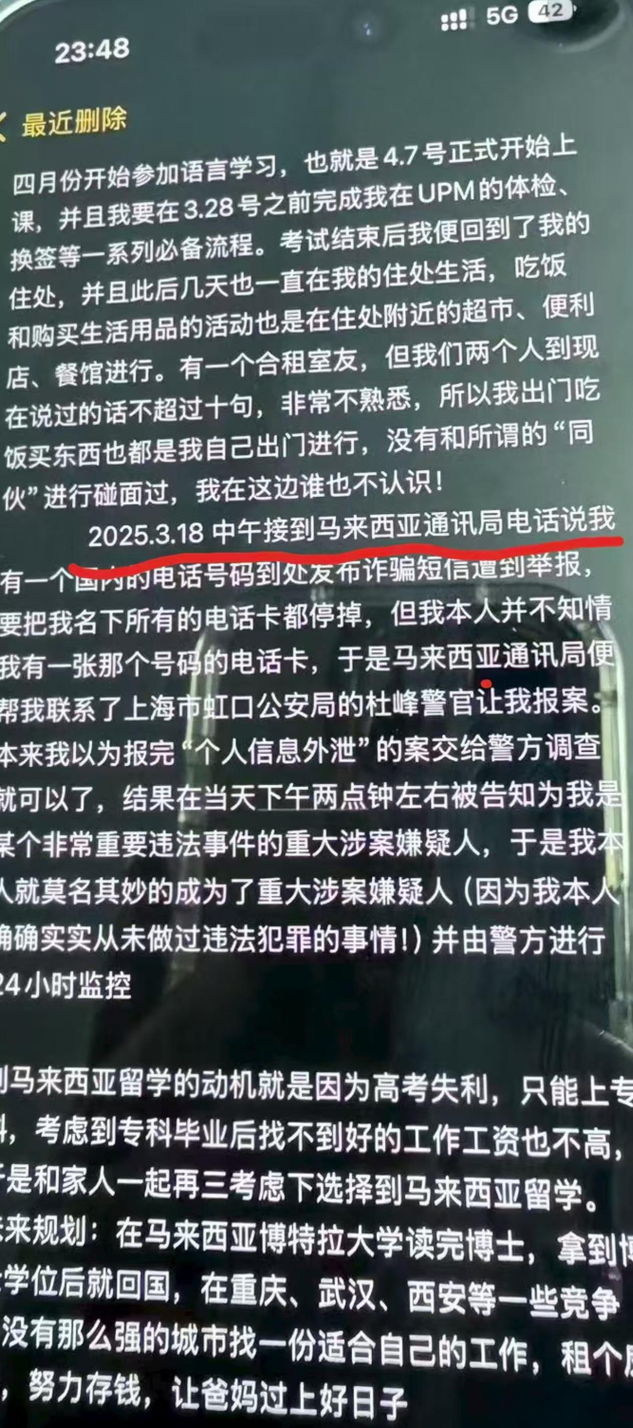 “自白書”還陳述了她接到“上海警察”電話的經(jīng)過:“2025.3.18中午接到馬來西亞通訊局電話說我有一個國內的電話號碼到處發(fā)布詐騙短信遭到舉報,要把我名下所有的電話卡停掉,但我本人并不知情我有一張那個號碼的電話卡,于是馬來西亞通訊局便幫我聯(lián)系了上海市的杜警官讓我報案。本來我以為報完‘個人信息外泄’的案交給警方調查就可以了,結果在當天下午兩點鐘左右被告知我是某個非常重要違法事件的重大涉案嫌疑人,于是我本人就莫名其妙成為了重大涉案嫌疑人(因為我本人確確實實從未做過違法犯罪的事情?。┎⒂删竭M行24小時監(jiān)控......”