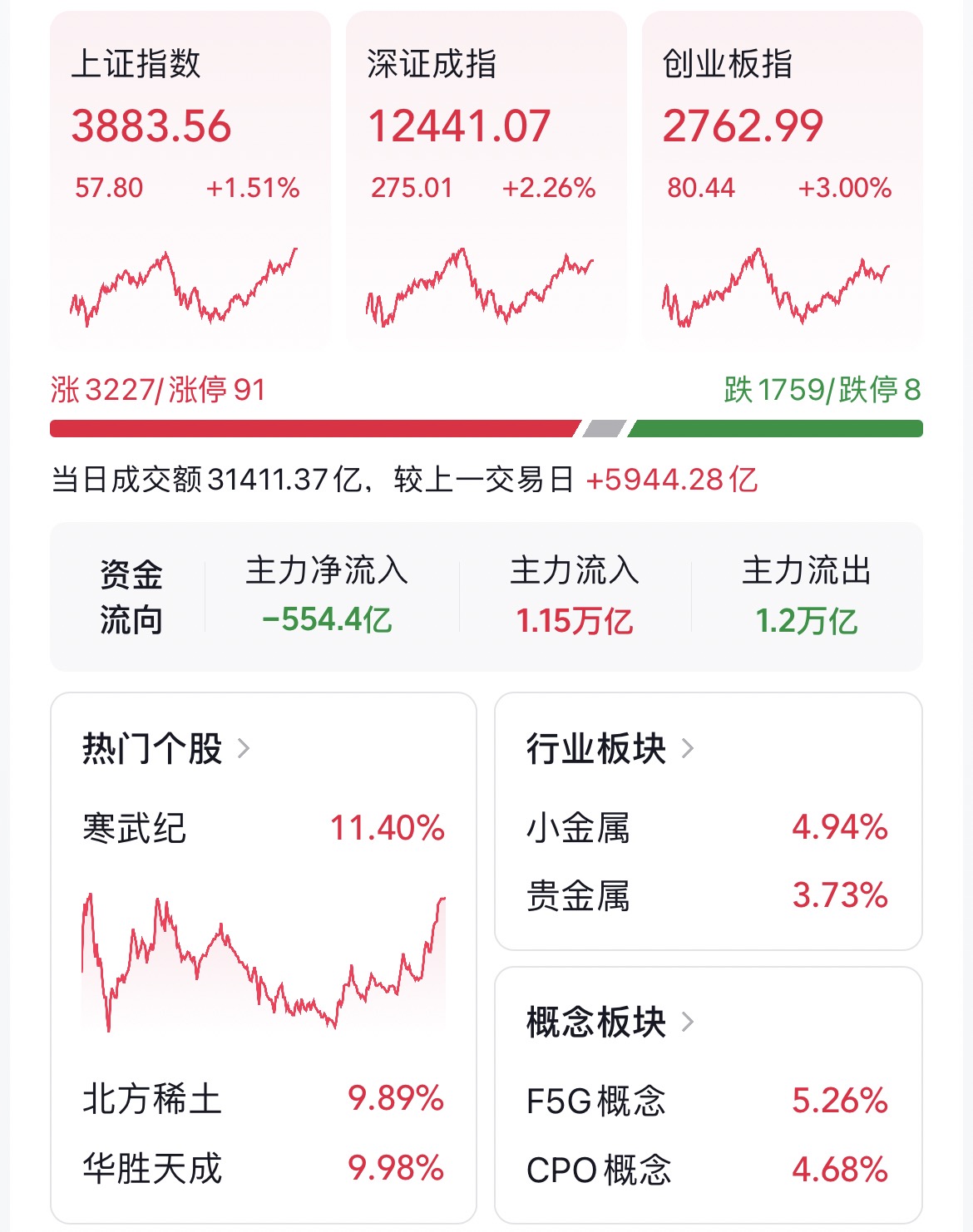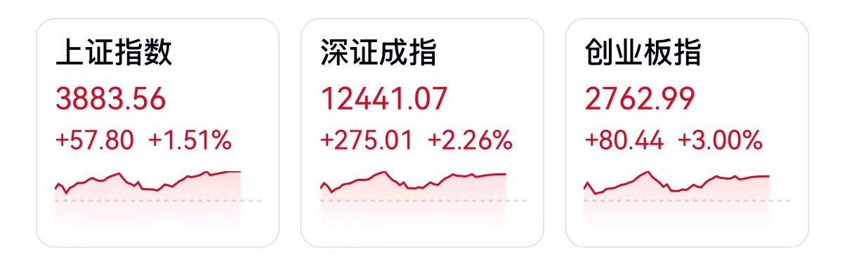 截至收盤,滬指報3883.56點,漲1.51%;深成指報12441.07點,漲2.26%;創(chuàng)指報2762.99點,漲3.00%。盤面上,稀土永磁、白酒板塊、F5G概念漲幅居前,賽馬概念、共享單車、芬太尼板塊跌幅居前。