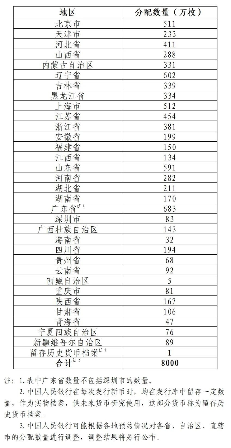 中國人民抗日戰(zhàn)爭暨世界反法西斯戰(zhàn)爭勝利80周年雙色銅合金紀念幣面額為10元,直徑為27毫米,材質(zhì)為雙色銅合金,發(fā)行數(shù)量為8000萬枚。各省、自治區(qū)、直轄市分配數(shù)量如下: