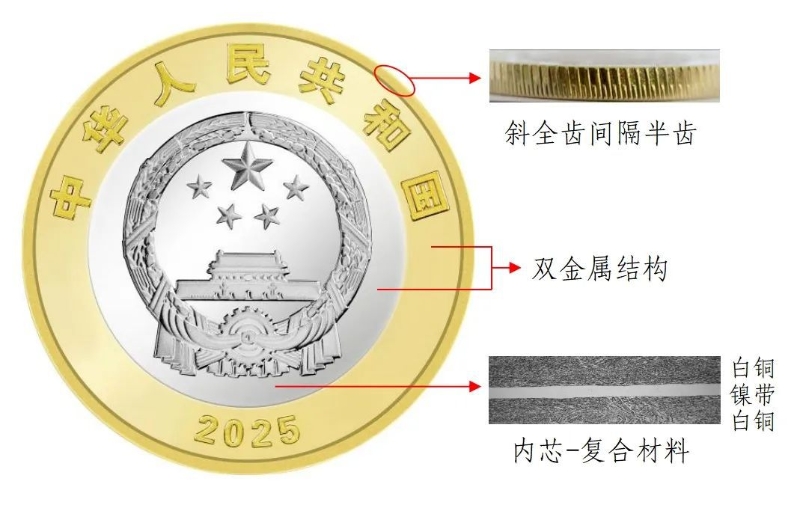 ▲圖3中國人民抗日戰(zhàn)爭暨世界反法西斯戰(zhàn)爭勝利80周年雙色銅合金紀念幣防偽特征示意圖