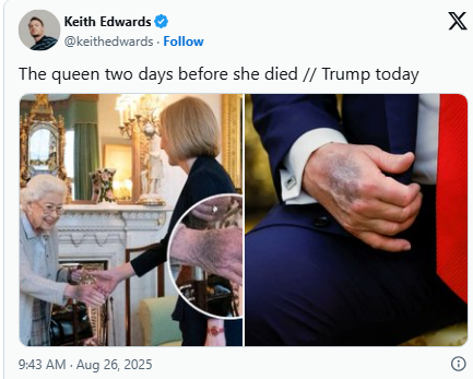曾是反特朗普共和黨人創(chuàng)立的超級(jí)政治行動(dòng)委員會(huì)“林肯計(jì)劃”(The Lincoln Project)工作人員,現(xiàn)為Youtuber的愛德華茲(Keith Edwards)貼出特朗普周一(25日)的手部照片與伊麗莎白女王二世過世前兩天的照片相比較。當(dāng)天女王接見時(shí)任英國(guó)首相特拉斯(Liz Truss)。有人因此猜測(cè)特朗普可能病重。由于特朗普時(shí)而試圖用化妝遮掩瘀青痕跡,更加引起外界對(duì)其健康狀況的疑慮。