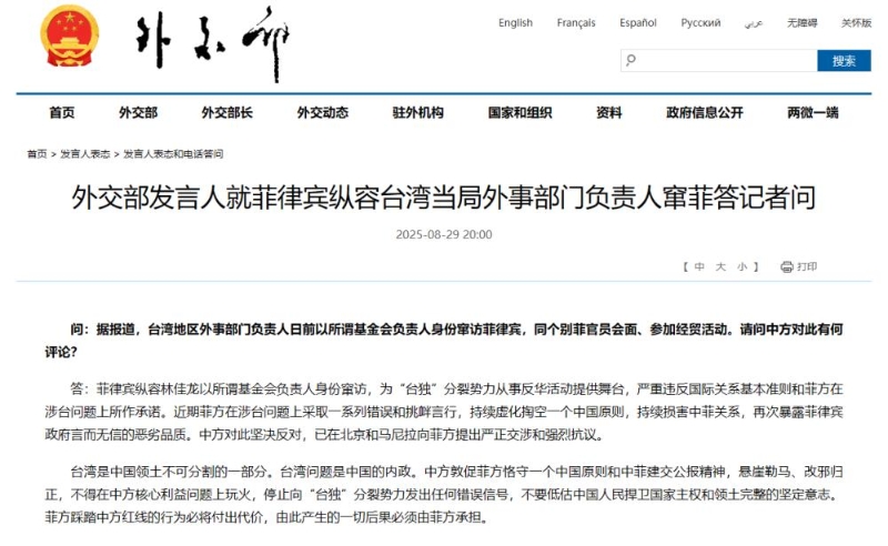 8月29日消息,外交部發(fā)言人就菲律賓縱容臺灣當(dāng)局外事部門負(fù)責(zé)人竄菲答記者問。
