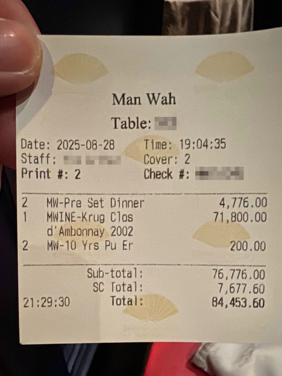 另外,帳單2個(gè)茶位為兩份10年普洱,合共索價(jià)200元,再加上開(kāi)了一支價(jià)值超過(guò)7萬(wàn)元超名貴香檳Krug Clos d'Ambonnay,最后計(jì)上約7677元加一服務(wù)費(fèi),令帳單隨即破8萬(wàn)元。