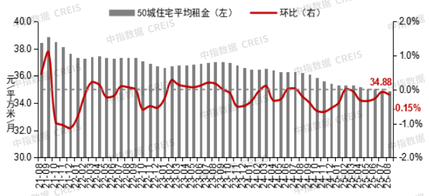 圖:2021年8月至2025年8月50城住宅平均租金及環(huán)比變化