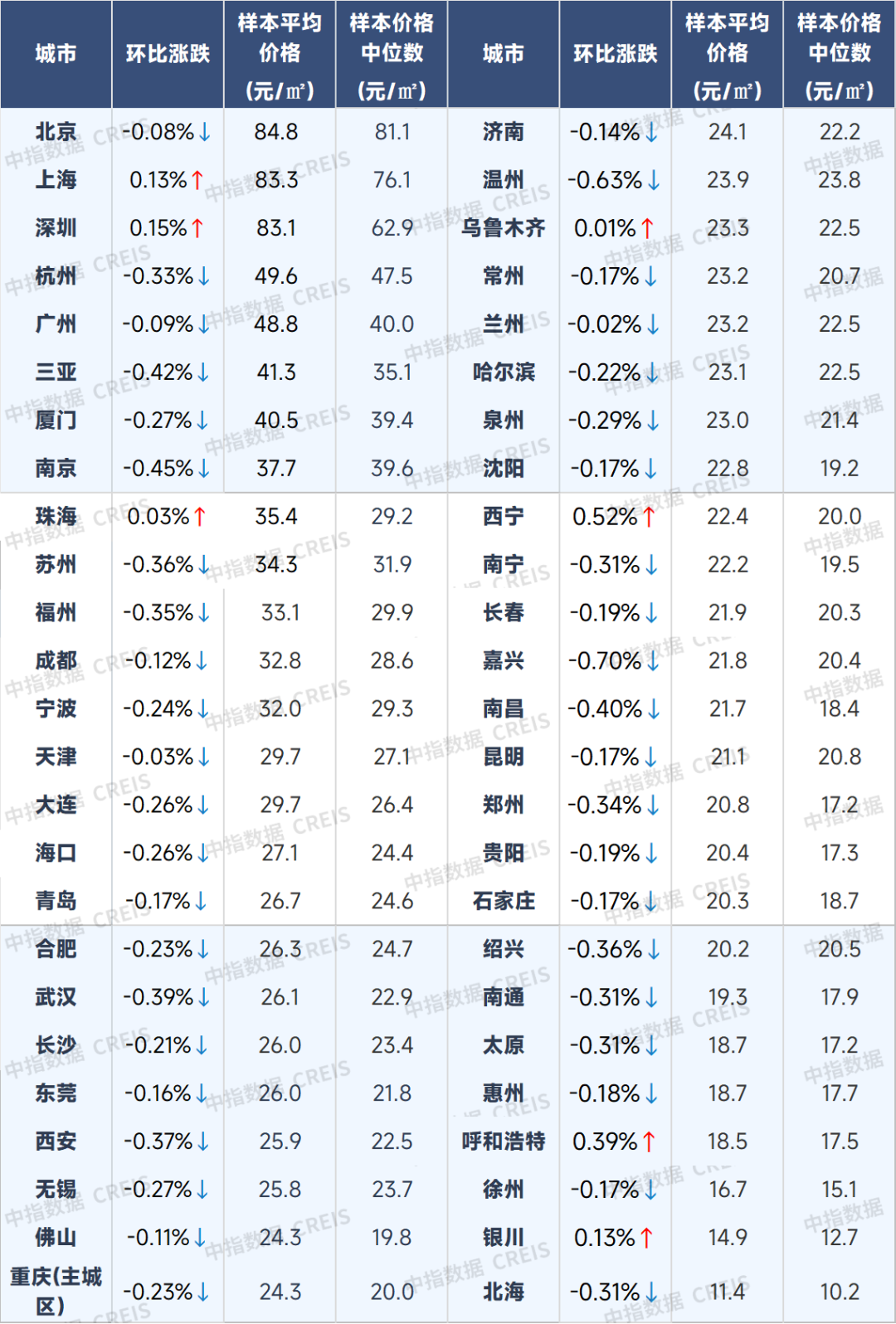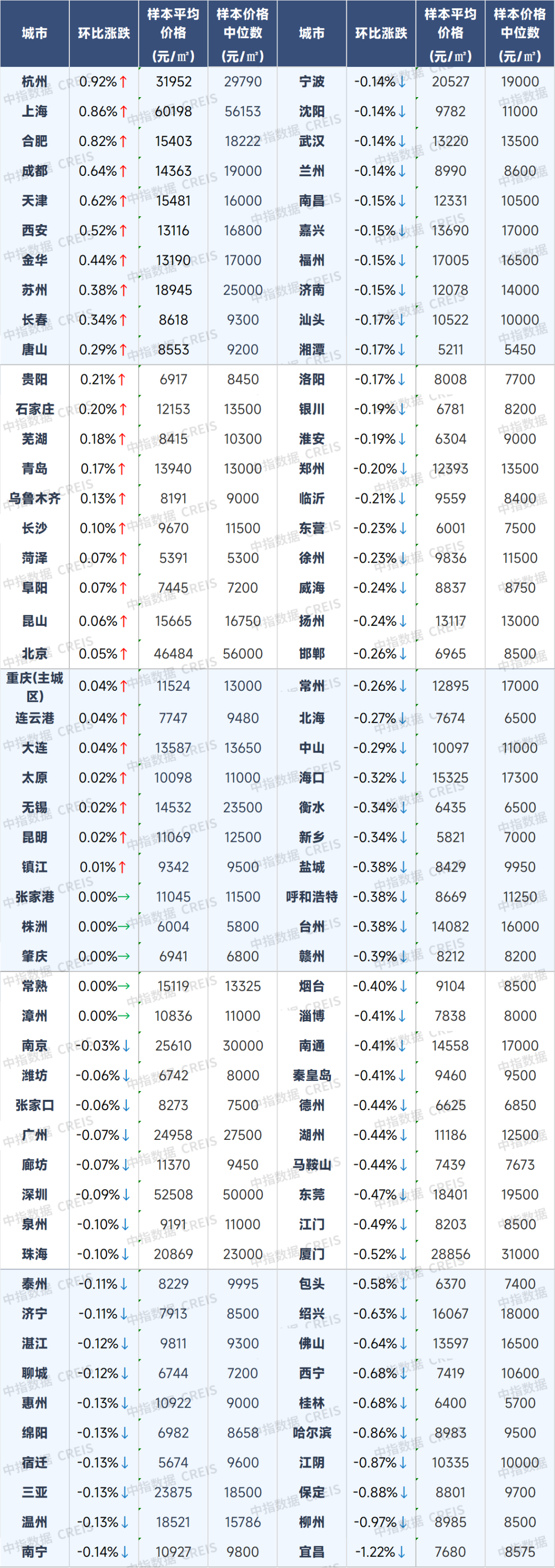 8月百城新建住宅價(jià)格及環(huán)比漲跌幅