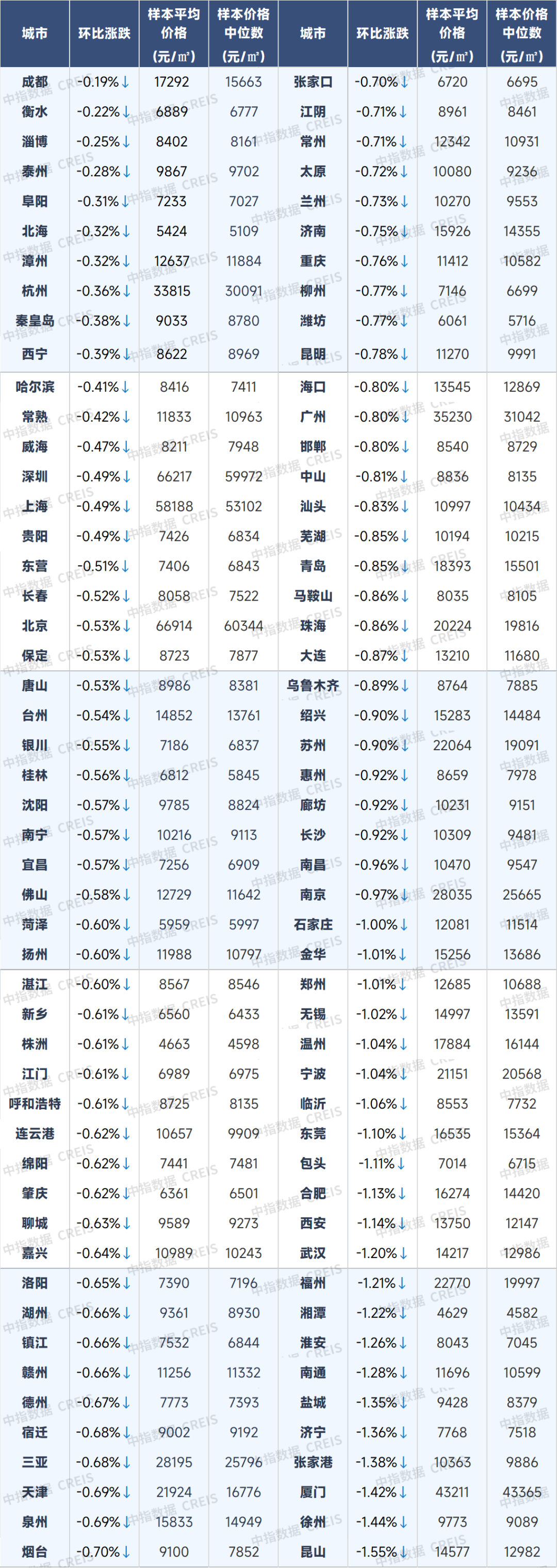 8月百城二手住宅價(jià)格及環(huán)比漲跌幅