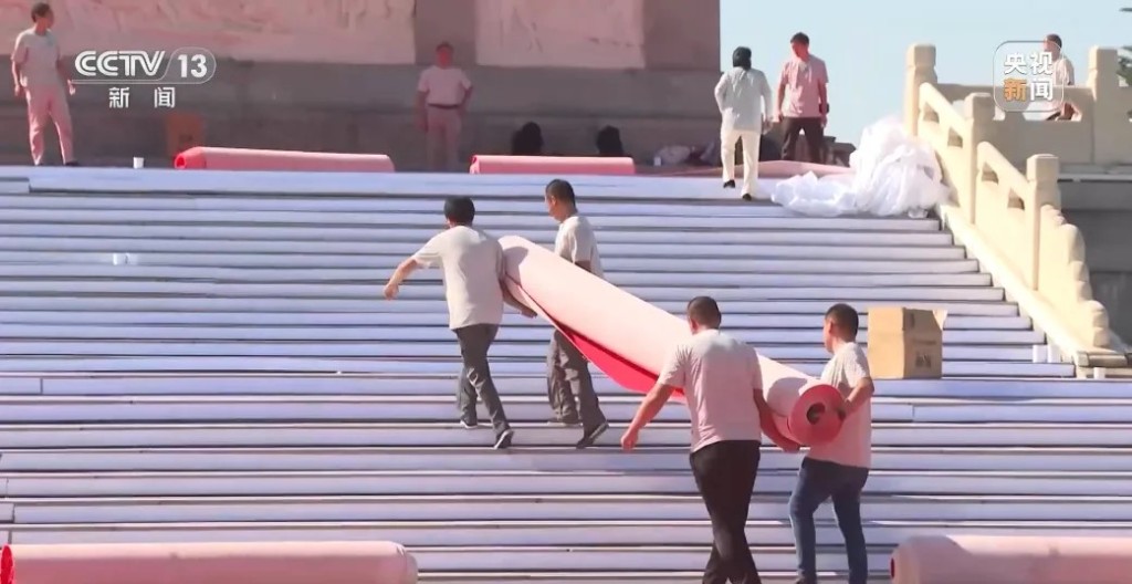 據(jù)央視報(bào)道,今早的天安門廣場(chǎng)有大批工作人員密鑼緊鼓為閱兵典禮作最后的布置,在核心區(qū)鋪設(shè)紅地毯。
