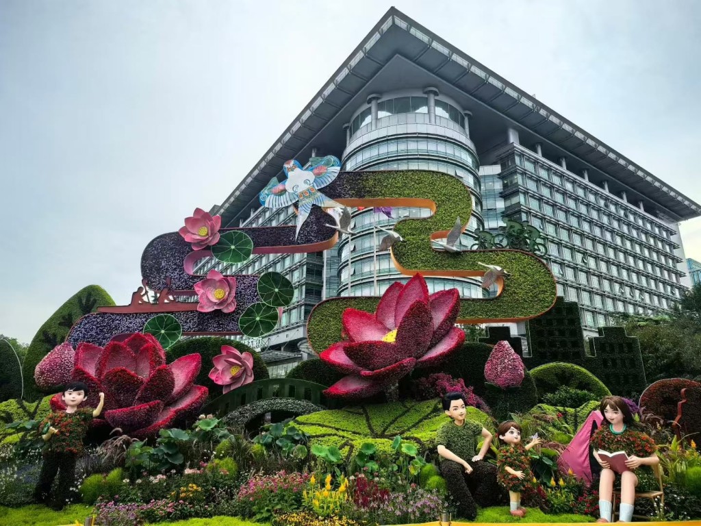 長(zhǎng)安街沿線設(shè)置了10組色彩鮮艷的花壇,分別以“美好明天” 、“繁榮發(fā)展” 、“科技強(qiáng)國(guó)”等為主題,晚上還會(huì)亮起燈光,吸引大批民眾前去拍照打卡。天安門廣場(chǎng)核心區(qū)布置亦已就緒,觀禮臺(tái)座椅采用金紅綠三色。