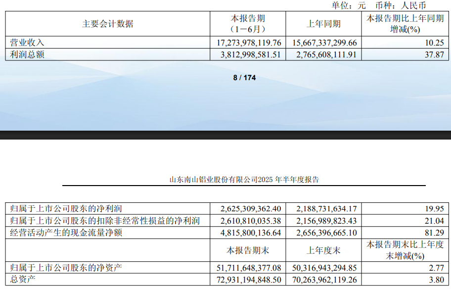 8月28日,南山鋁業(yè)(SH600219)發(fā)布2025年半年報(bào),上半年同比營收利潤雙位數(shù)增長。