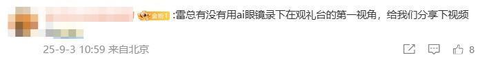 而在雷軍曬出觀禮請(qǐng)柬那條博文的評(píng)論區(qū),有網(wǎng)友曬出雷軍坐在觀禮臺(tái)的照片。還有不少網(wǎng)友發(fā)現(xiàn)雷軍觀禮時(shí)戴著小米AI眼鏡,“想看今天雷總AI眼鏡錄的視頻”“雷總有沒有用AI眼鏡錄下在觀禮臺(tái)的第一視角,給我們分享下視頻唄”。