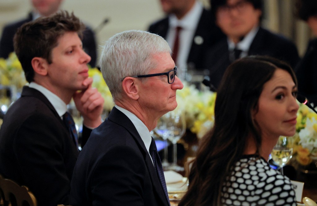 ▲特朗普點(diǎn)名蘋果行政總裁庫(kù)克(中)的情況很好。路透社