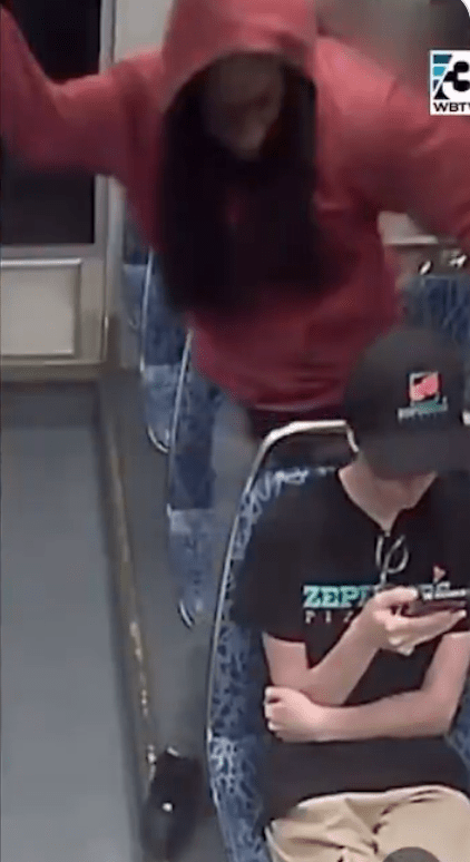 ▲案發(fā)于8月22日晚間約9時46分,伊琳娜身穿披薩店制服,登上“Lynx Blue Line”輕軌列車,坐下后低頭查看手機,絲毫未察覺身后的危險。四分鐘后,迪卡羅斯突然從座位掏出折疊刀,撲向伊琳娜,朝其頸部等處連刺三刀。WBTV 視頻截圖