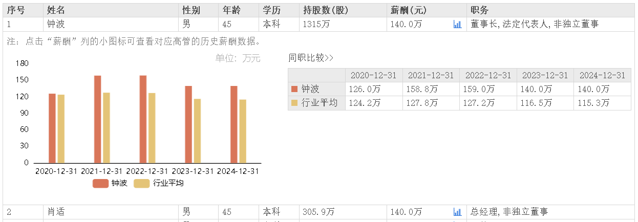 據(jù)東方財(cái)富網(wǎng)數(shù)據(jù),極米科技董事長鐘波和總經(jīng)理肖適2024年所獲薪酬同為140萬元。