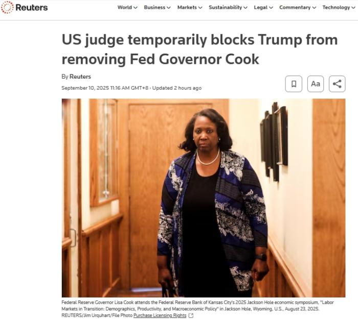 特朗普罷免美聯(lián)儲(chǔ)理事庫克受阻