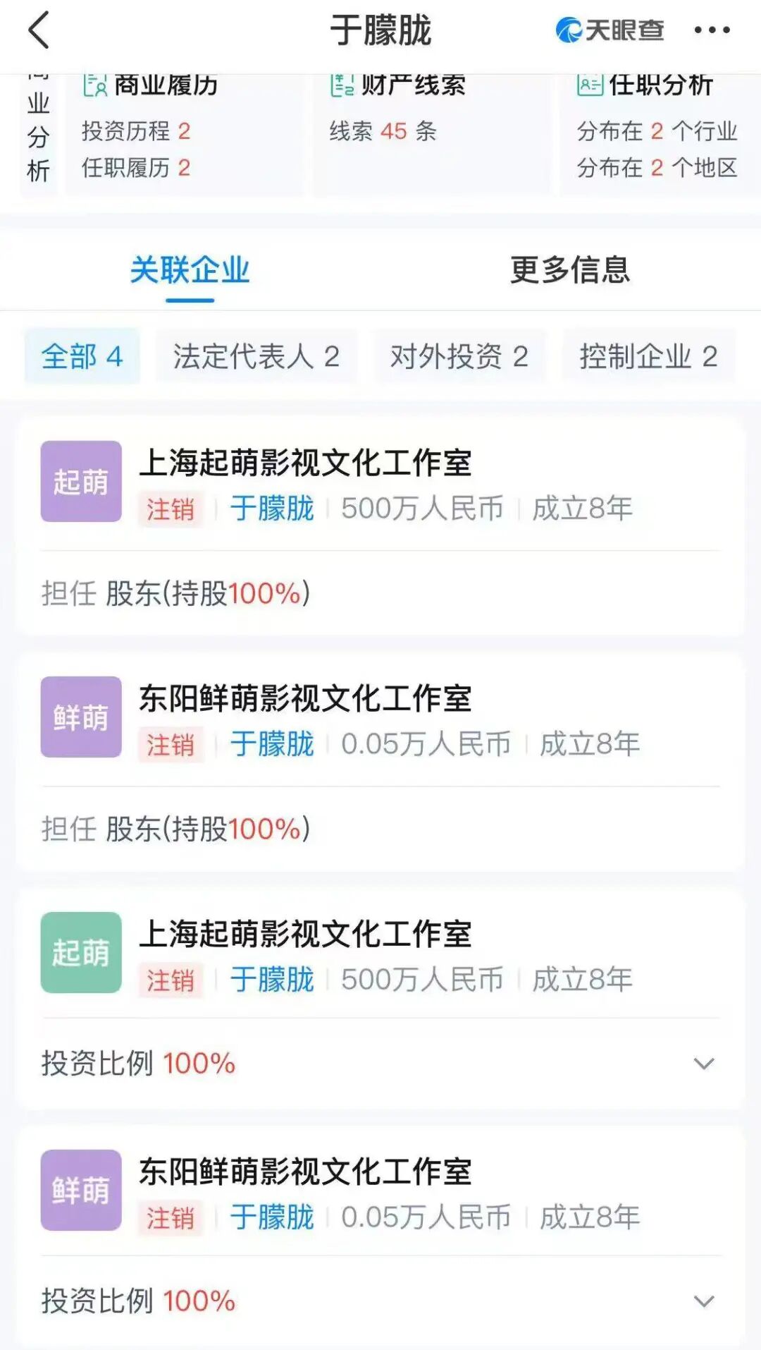 9月11日,演員于朦朧的名字突然沖上熱搜。據(jù)天眼查顯示,于朦朧名下所有持股公司均顯示注銷,時(shí)間分別在去年年底和今年7月。
