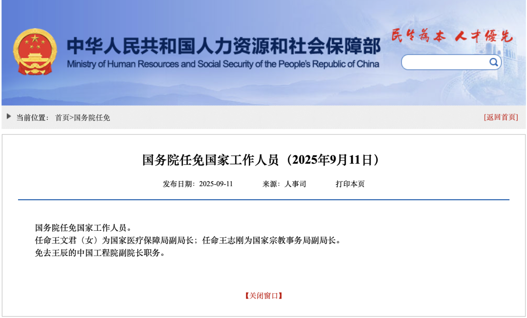 據(jù)人社部官網(wǎng)9月11日消息,國務(wù)院任免國家工作人員。任命王文君(女)為國家醫(yī)療保障局副局長;任命王志剛為國家宗教事務(wù)局副局長。免去王辰的中國工程院副院長職務(wù)。