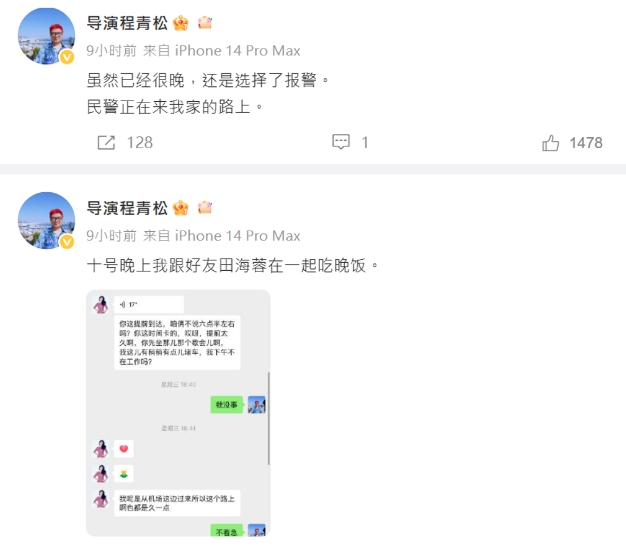 據(jù)狗仔爆料,于朦朧案發(fā)前一晚在家中和5名朋友吃飯。 網(wǎng)傳這5位人正是于朦朧經(jīng)紀(jì)人、助理、摯友高泰宇、編劇極極光、導(dǎo)演程青松。但程青松連發(fā)4條文撇清,“昨天下午在北京展覽館看時(shí)裝設(shè)計(jì)師葉謙的26春秋時(shí)裝發(fā)布會(huì)”、“昨天約好和闞昕一起去看秀,看完秀跟老同學(xué)張玉紅一起吃晚飯”、“我這幾年都是紅頭發(fā),我完全不認(rèn)識(shí)當(dāng)事人,請不要造謠”、“十號晚上我跟好友田海蓉在一起吃晚飯”,以及PO對話截圖,強(qiáng)調(diào)自己有不在場證明。 程青松今凌晨4點(diǎn),再度發(fā)文:“雖然已經(jīng)很晚,還是選擇了報(bào)警。 警察正在來我家的路上。”