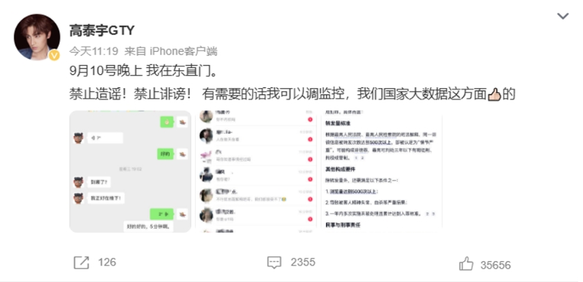 同樣被點(diǎn)名的高泰宇,今(12日)也附上對話截圖澄清:“9月10號晚上我在東直門。 禁止造謠! 禁止誹謗! 有需要的話我可以調(diào)監(jiān)控?!?,呼吁網(wǎng)友別涉嫌造謠誹謗罪。