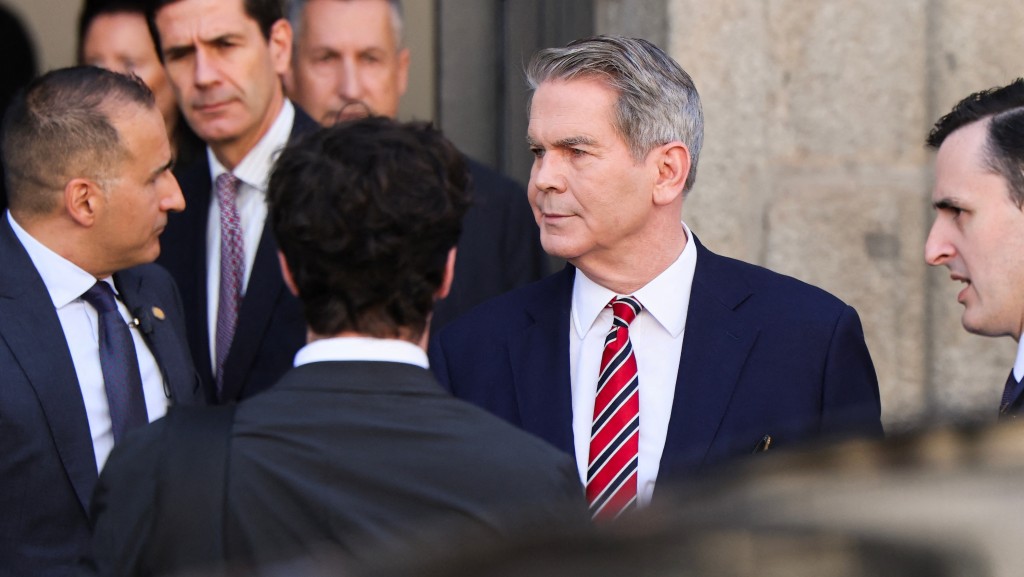 ▲周日會(huì)談結(jié)束后,貝森特表示:“我們明天早上再開始。”法新社
