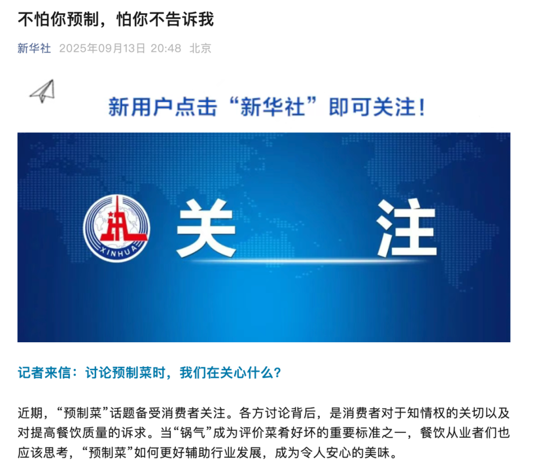 9月13日晚間,新華社發(fā)布文章《不怕你預(yù)制,怕你不告訴我》。文章認(rèn)為,各方討論背后,是消費(fèi)者對于知情權(quán)的關(guān)切以及對提高餐飲質(zhì)量的訴求。當(dāng)“鍋氣”成為評價(jià)菜肴好壞的重要標(biāo)準(zhǔn)之一,餐飲從業(yè)者們也應(yīng)該思考,“預(yù)制菜”如何更好輔助行業(yè)發(fā)展,成為令人安心的美味。