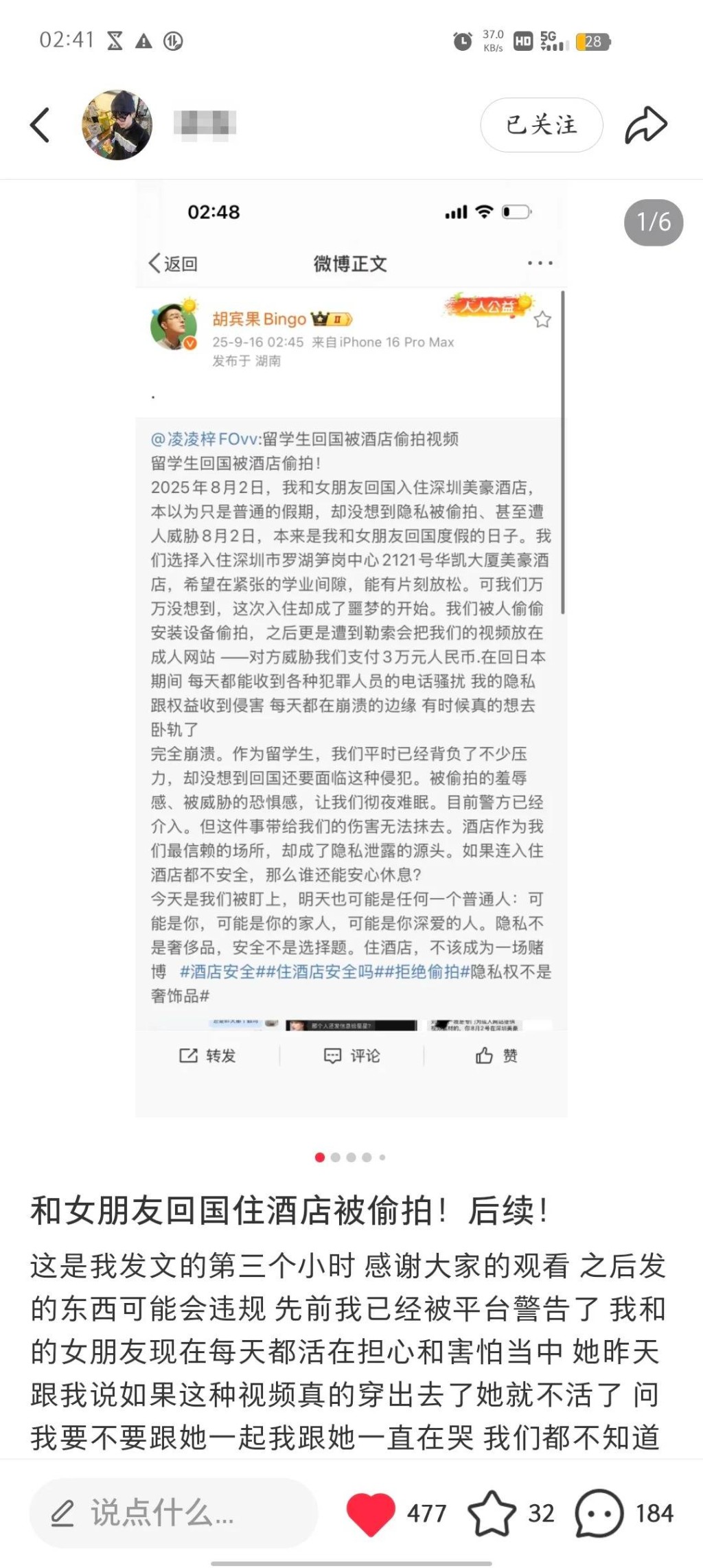 他表示,想不到回國度假,會連入住酒店也不安全,私隱被侵犯,“被偷拍的羞辱感、被威脅的恐懼感,讓我們徹夜難眠”。 事主透露,已就事件報警。