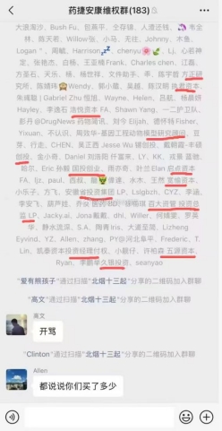 當日一大早,有網(wǎng)友貼出了一張新組建的微信群聊截圖,名為“藥捷安康維權(quán)群”,當時群里已有183人,其中不少群友還掛著投資機構(gòu)的名字,有人在群里喊“開罵”,隨后有人問:“都說說你們買了多少?”