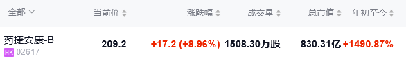 按6月23日上市13.15港元/股的發(fā)行價算,上市僅87天的藥捷安康,股價已上漲1490.87%。