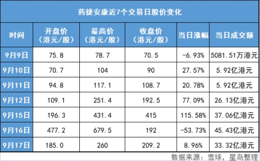若聚焦最近一周,從股價暴漲前夕,即9月9日70.5港元/股的收盤價,到暴跌后9月17日209.2港元/股的收盤價,藥捷安康一周的股價漲幅已達196.74%,期間最高的單日交易額達45.43億港元。