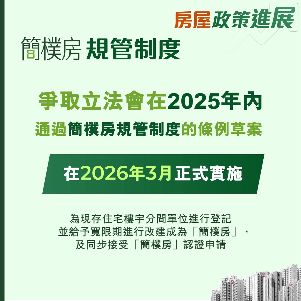 何永賢指,本屆政府將綜合輪候公屋時間下降至5.1年;以快速興建的方式,為有迫切住屋需要的市民提供3萬個簡約公屋;增加資助出售單位供應;助力青年置業(yè);收緊富戶政策;促進建筑科技應用;推動智慧屋邨管理;推行“共筑. 創(chuàng)業(yè)家計劃,與商界攜手支持青年實踐創(chuàng)業(yè)夢想; 爭取立法會今年內通過簡樸房規(guī)管制度的條例草案。