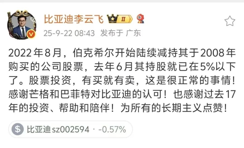 9月22日早間,比亞迪集團(tuán)品牌及公關(guān)處總經(jīng)理李云飛在社交平臺(tái)發(fā)文回應(yīng)稱,2022年8月,伯克希爾開始陸續(xù)減持其于2008年購買的公司股票,去年6月其持股就已在5%以下了。