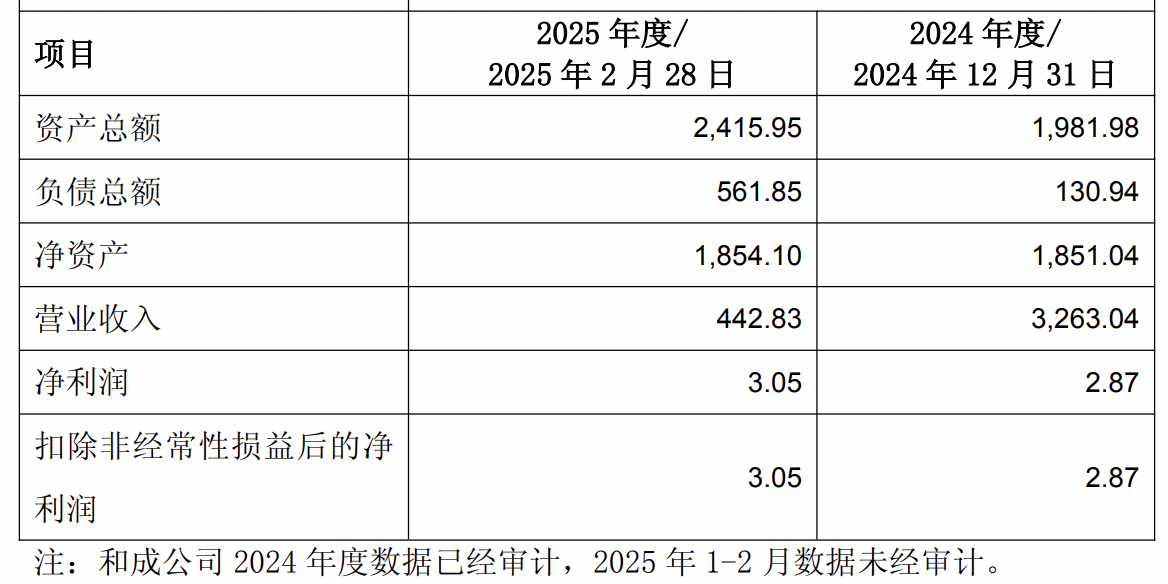 2024年、2025年前2月,和成制藥營(yíng)業(yè)收入為3263.04萬(wàn)元、442.83萬(wàn)元,凈利潤(rùn)分別為2.87萬(wàn)元、3.05萬(wàn)元。截至2025年2月末,該標(biāo)的資產(chǎn)總額2415.95萬(wàn)元,負(fù)債總額561.85萬(wàn)元。