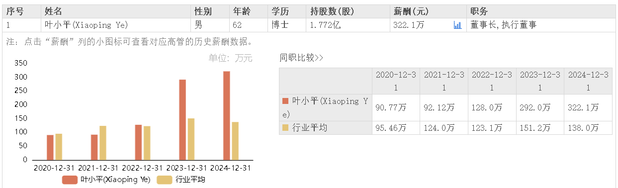 據(jù)東方財(cái)富網(wǎng)數(shù)據(jù)及泰格醫(yī)藥歷年年報(bào),泰格醫(yī)藥董事長葉小平(Xiaoping Ye)2019年至2024年所獲薪酬分別為81.82萬元、90.77萬元、92.12萬元、128萬元、292萬元和322.1萬元,連續(xù)5年漲薪。