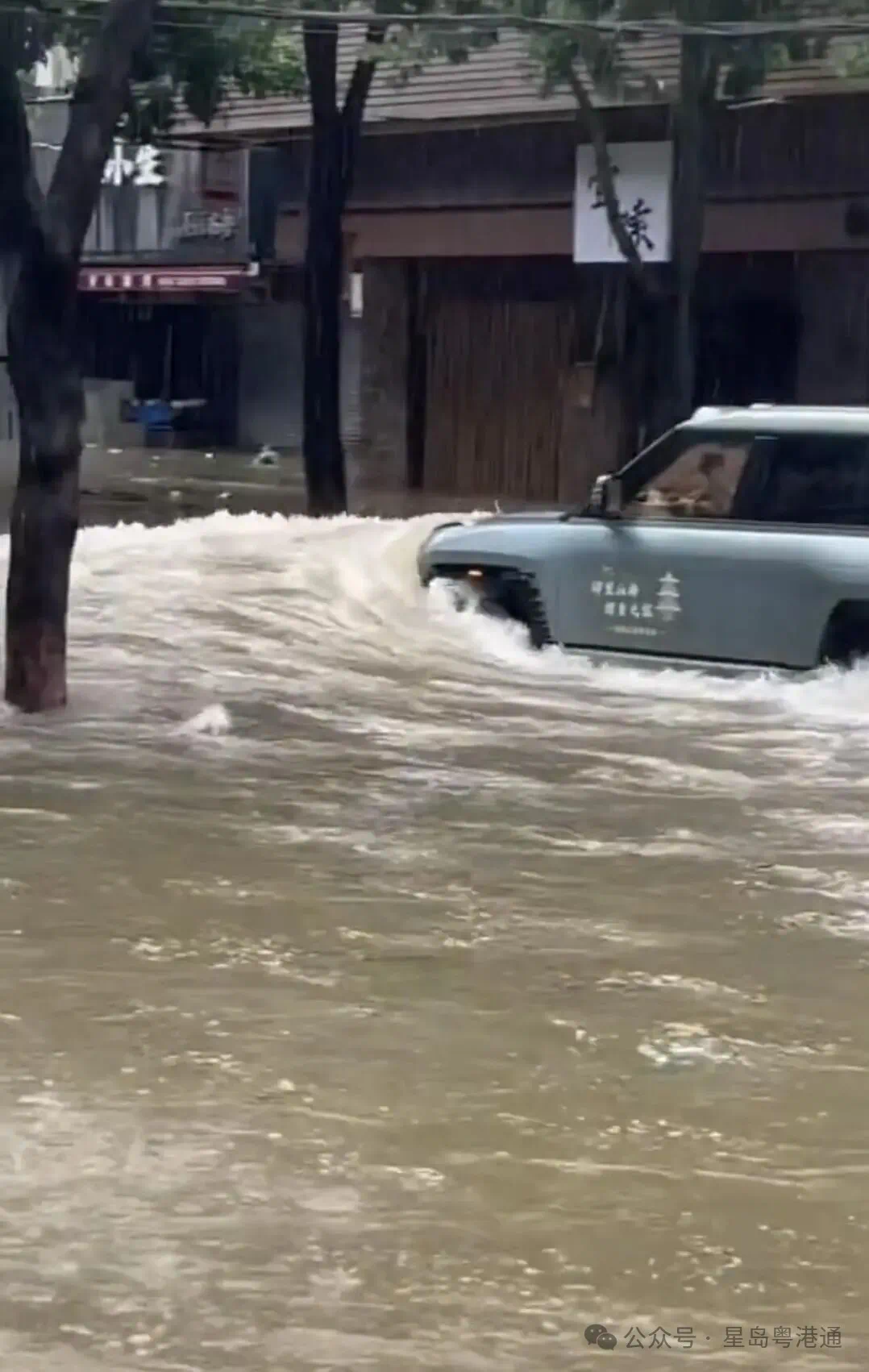 ▲車輛掀起的水浪沖向臨街商鋪。