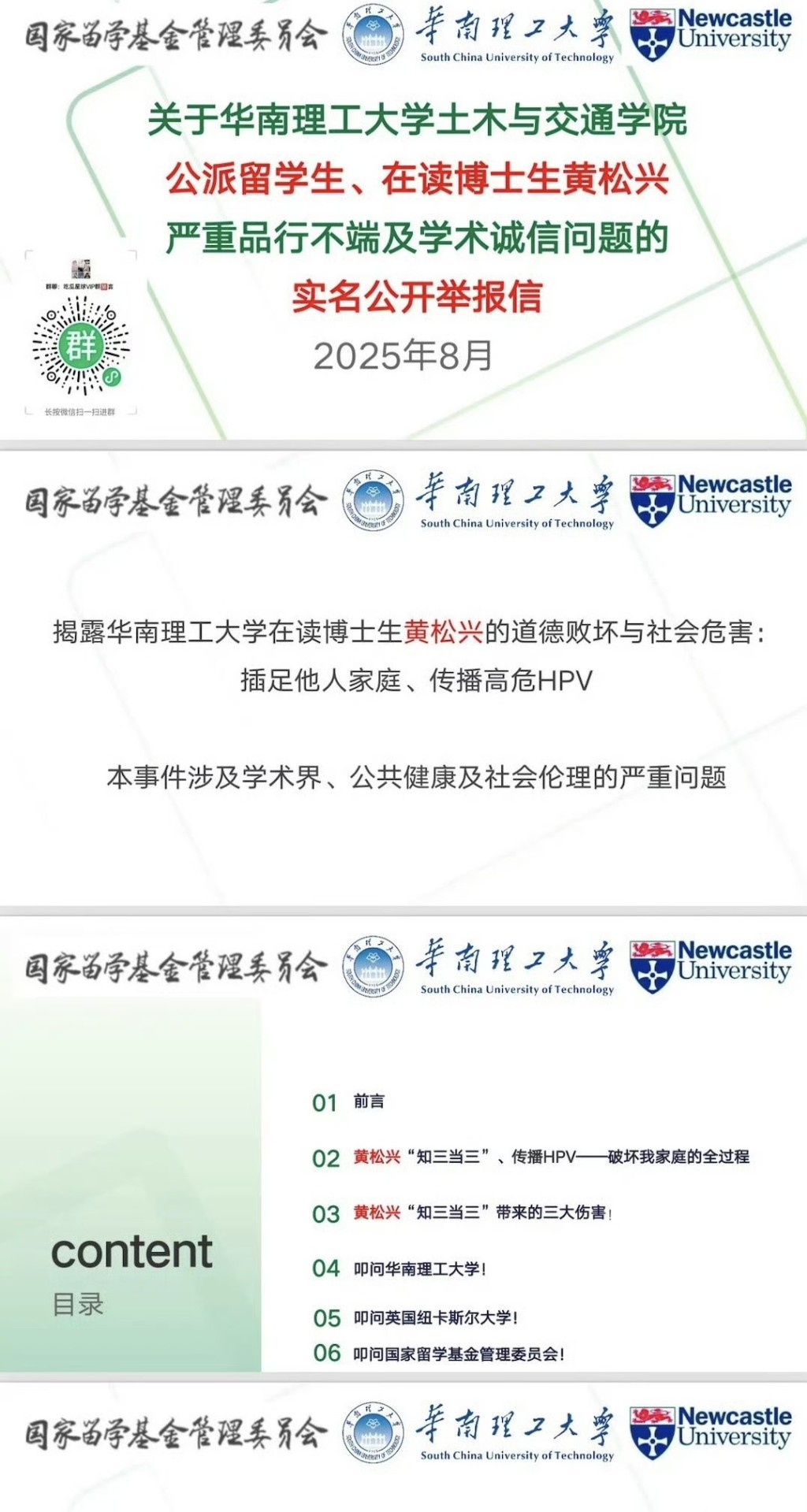 近日,網(wǎng)絡(luò)流傳一份長達68頁的PowerPoint文件,署名為“守護孩子和尊嚴的父親”的網(wǎng)民實名舉報華南理工大學(xué)在讀博士生黃某興,與其妻子王某長期存在不正當關(guān)系,事件引發(fā)熱議。據(jù)奔流新聞報道,25日,華南理工大學(xué)學(xué)工部職員回應(yīng)表示,校方接獲舉報后已對黃某興作出留校察看處分。
