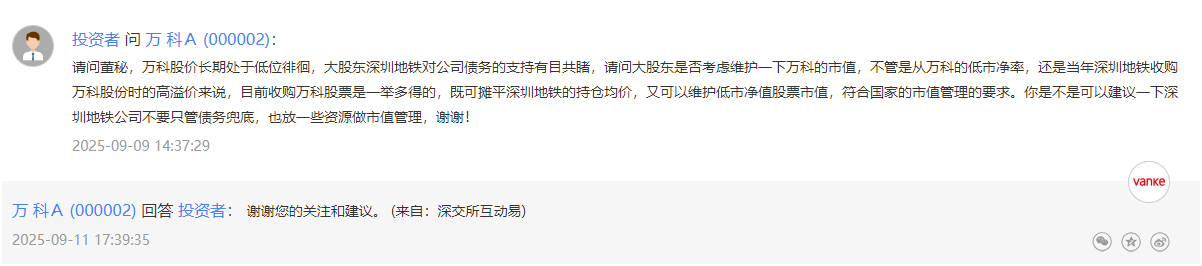 2025年9月9日,有投資者向萬(wàn)科董秘提出,希望建議大股東深鐵集團(tuán)不要只管債務(wù)兜底,也放一些資源做市值管理。該人士認(rèn)為,萬(wàn)科當(dāng)下市凈率較低,同時(shí)深鐵當(dāng)年收購(gòu)萬(wàn)科的股價(jià)溢價(jià)頗高,目前增持萬(wàn)科股票實(shí)屬一舉多得,既可平攤深鐵的持倉(cāng)均價(jià),又可以維護(hù)股票市值,符合國(guó)家關(guān)于市值管理的導(dǎo)向。