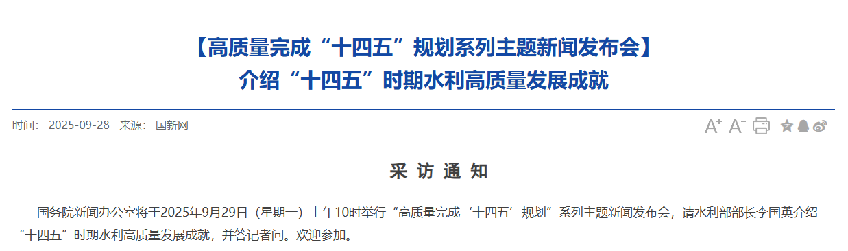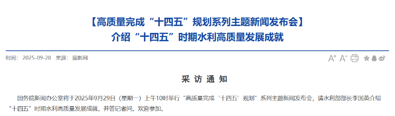 國(guó)務(wù)院新聞辦公室將于2025年9月29日(星期一)上午10時(shí)舉行“高質(zhì)量完成‘十四五’規(guī)劃”系列主題新聞發(fā)布會(huì),請(qǐng)水利部部長(zhǎng)李國(guó)英介紹“十四五”時(shí)期水利高質(zhì)量發(fā)展成就,并答記者問(wèn)。