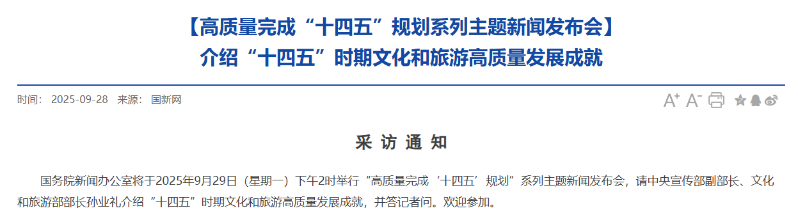 國(guó)務(wù)院新聞辦公室將于2025年9月29日(星期一)下午2時(shí)舉行“高質(zhì)量完成‘十四五’規(guī)劃”系列主題新聞發(fā)布會(huì),請(qǐng)中央宣傳部副部長(zhǎng)、文化和旅游部部長(zhǎng)孫業(yè)禮介紹“十四五”時(shí)期文化和旅游高質(zhì)量發(fā)展成就,并答記者問(wèn)。