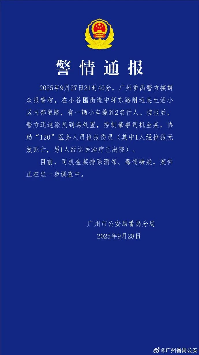 據(jù)澎湃新聞,廣州市公安局番禺分局昨(28日)晚通報一宗交通事故:9月27日晚9時40分,廣州番禺警方接群眾報警稱,在小谷圍街道中環(huán)東路附近某生活小區(qū)內(nèi)部道路,有一輛汽車撞到2名行人。接報后,警方迅速派員到場處置,控制金姓肇事司機,醫(yī)務人員搶救中證實,1人搶救無效死亡,另1人經(jīng)送醫(yī)治療已出院。目前,肇事的金姓司機排除酒駕、毒駕嫌疑,案件正在進一步調(diào)查中。