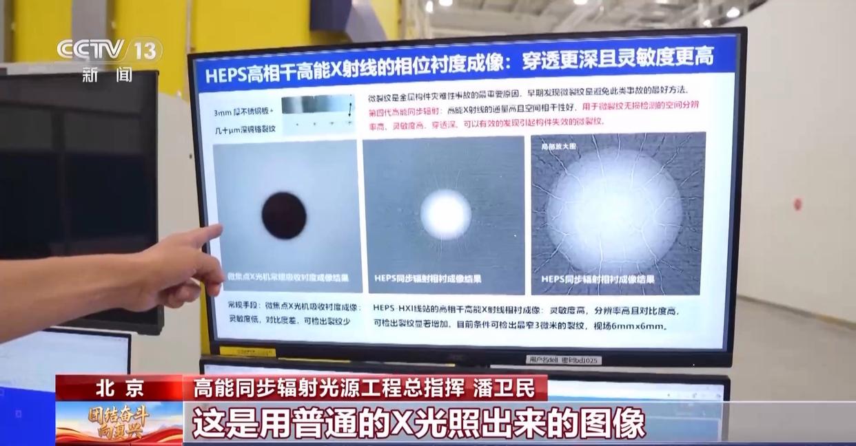 高能同步輻射光源工程總指揮潘衛(wèi)民介紹,現(xiàn)在高能同步輻射光源已經(jīng)開(kāi)始進(jìn)行光學(xué)實(shí)驗(yàn)了。3毫米的不銹鋼板,相較于普通X光照出的圖像,用高能光源照出來(lái)的裂紋非常清晰。體現(xiàn)了第四代光源清晰度的性能水平,為今后的實(shí)驗(yàn)奠定了重要的基礎(chǔ)。