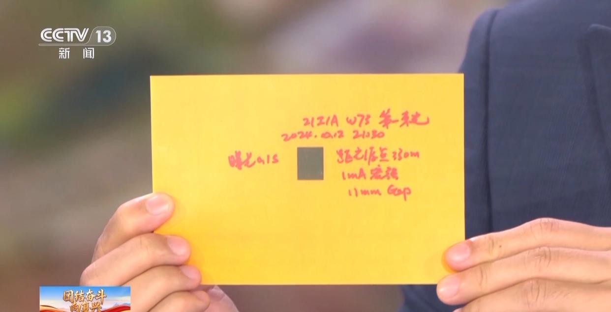 高能同步輻射光源第一次發(fā)出光時(shí),科研人員用一張黃色感光紙放在光路上,記錄下的一個(gè)黑色斑點(diǎn)。上面手寫(xiě)記錄了2024年10月12日21時(shí)30分,第一束光等內(nèi)容。這個(gè)黑色方形斑點(diǎn)就是高能同步輻射光源發(fā)出第一束光的標(biāo)志。