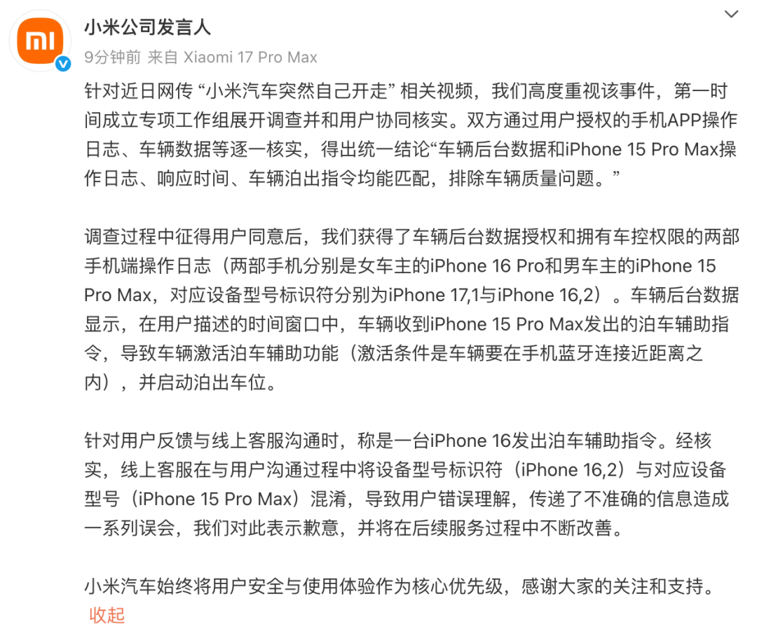 針對近日網(wǎng)傳 “小米汽車突然自己開走” 相關(guān)視頻,我們高度重視該事件,第一時間成立專項(xiàng)工作組展開調(diào)查并和用戶協(xié)同核實(shí)。雙方通過用戶授權(quán)的手機(jī)APP操作日志、車輛數(shù)據(jù)等逐一核實(shí),得出統(tǒng)一結(jié)論“車輛后臺數(shù)據(jù)和iPhone 15 Pro Max操作日志、響應(yīng)時間、車輛泊出指令均能匹配,排除車輛質(zhì)量問題?!?/p>