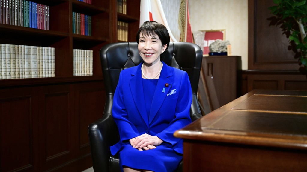 高市早苗當(dāng)選自民黨總裁后,在新辦公室拍照。