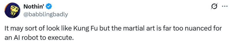 但也有網(wǎng)友表示,“這看起來或許有點像功夫,但武術(shù)的精妙程度遠非AI機器人所能掌握?!?/p>
