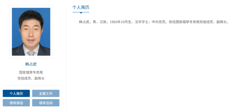 國家煙草專賣局網(wǎng)站顯示,韓占武,男,漢族,1966年10月生,法學(xué)學(xué)士,中共黨員。現(xiàn)任國家煙草專賣局黨組成員、副局長。