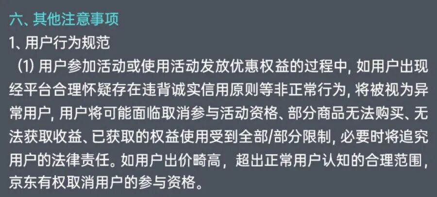 此外,競價成功的用戶會收到短信支付提醒,一小時內(nèi)仍未提交訂單的用戶將收到電話支付提醒。用戶需要在競價成功后24小時內(nèi)提交訂單,并在30分鐘內(nèi)支付貨款,若逾期未提單或逾期未支付,訂單將被取消。若用戶出價畸高,“超出正常用戶認知的合理范圍”,京東有權(quán)取消用戶的參與資格。
