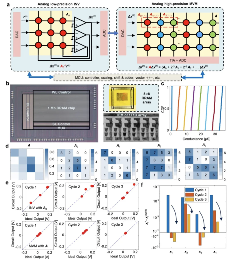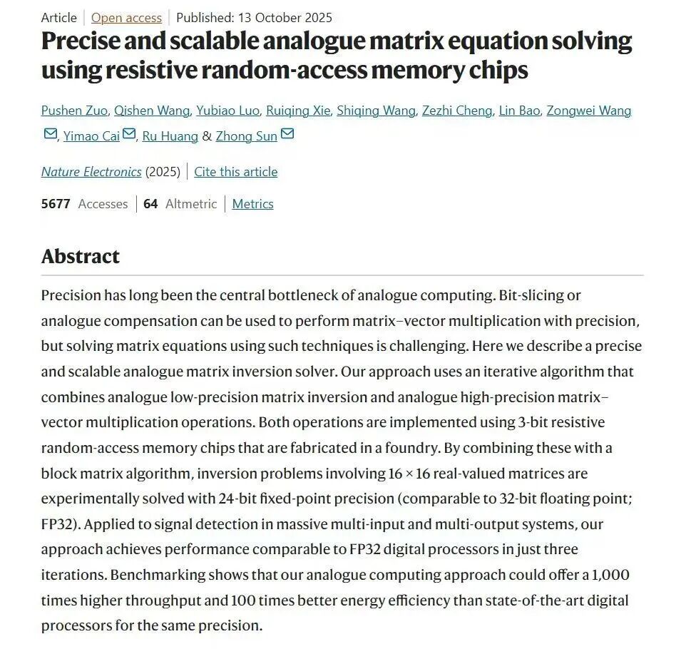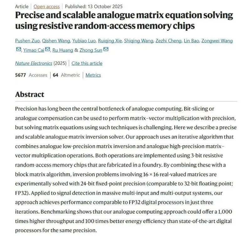 在計算精度方面,團隊在實驗上成功實現(xiàn)16×16矩陣的24比特定點數(shù)精度求逆,矩陣方程求解經(jīng)過10次迭代后,相對誤差可低至10??量級。在計算性能方面,在求解32×32矩陣求逆問題時,其算力已超越高端GPU的單核性能;當問題規(guī)模擴大至128×128時,計算吞吐量更達到頂級數(shù)字處理器的1000倍以上,傳統(tǒng)GPU干一天的活,這款芯片一分鐘就能搞定。