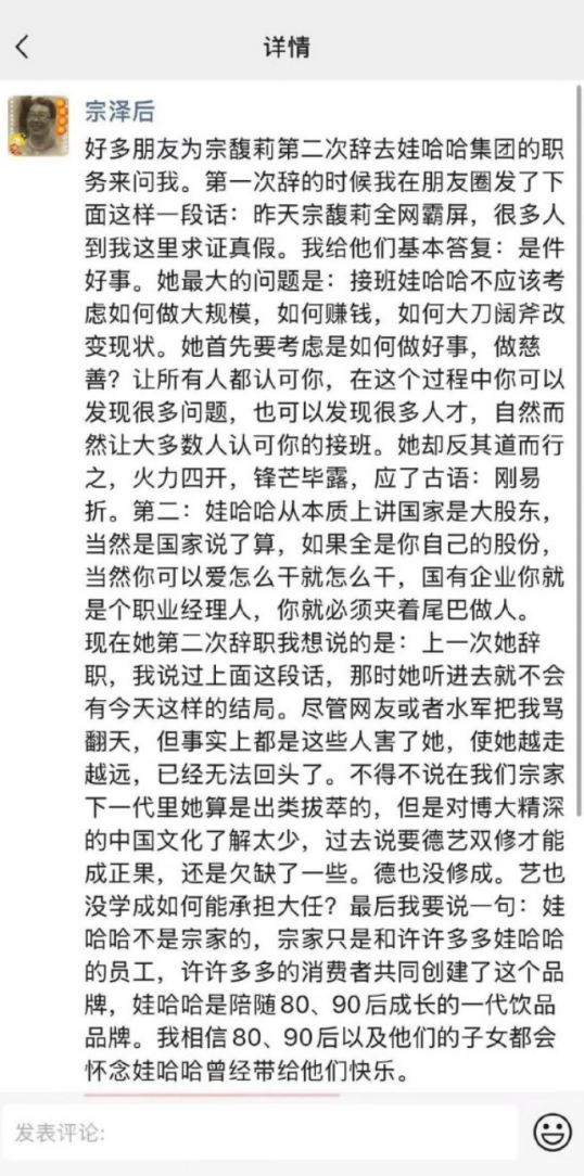 今年9月,宗馥莉第二次辭職后,宗澤后又發(fā)聲說水軍害了她,更表示“娃哈哈不是宗家的,宗家只是和許許多多娃哈哈的員工,許許多多的消費者共同創(chuàng)建了這個品牌?!?/p>