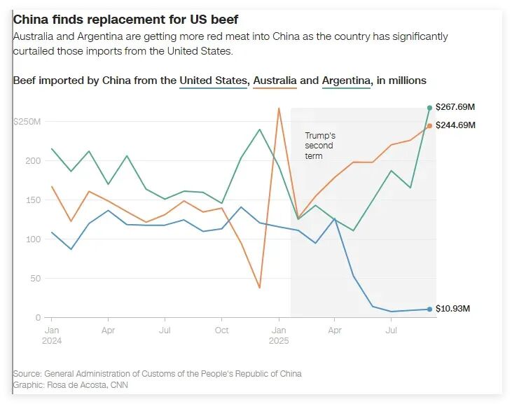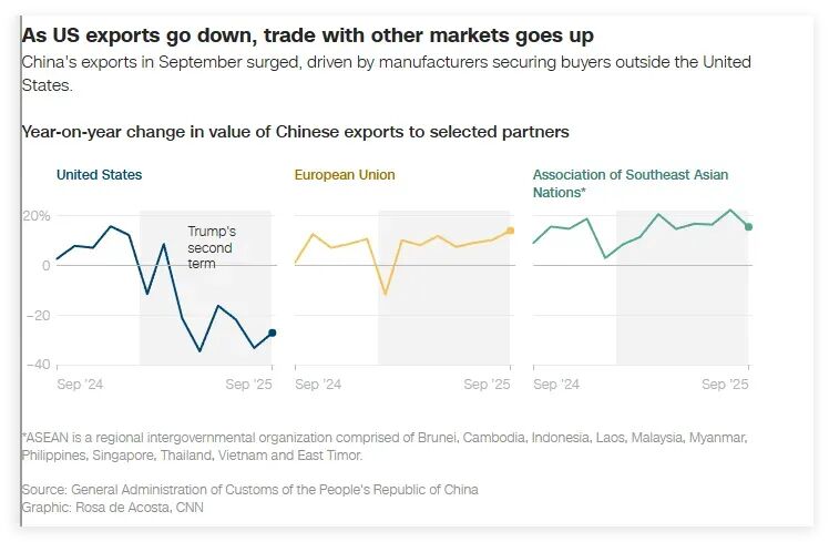 CNN稱,雖然中國對(duì)美國的出口額隨著特朗普第二個(gè)任期的到來同比出現(xiàn)下降,但中國與其他市場(chǎng)的貿(mào)易同期都在增加,這也令中國在對(duì)美出口總額同比下降的情況下,今年截至9月的出口總額仍實(shí)現(xiàn)了6.1%的增長。